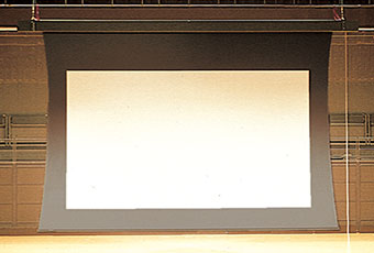 - ● 背面から投射できる距離が得られるようステージ最前列のバトンに吊り下げ、不要な時には簡単に撤去できるようカスタムタイプの電動スクリーンを設計。