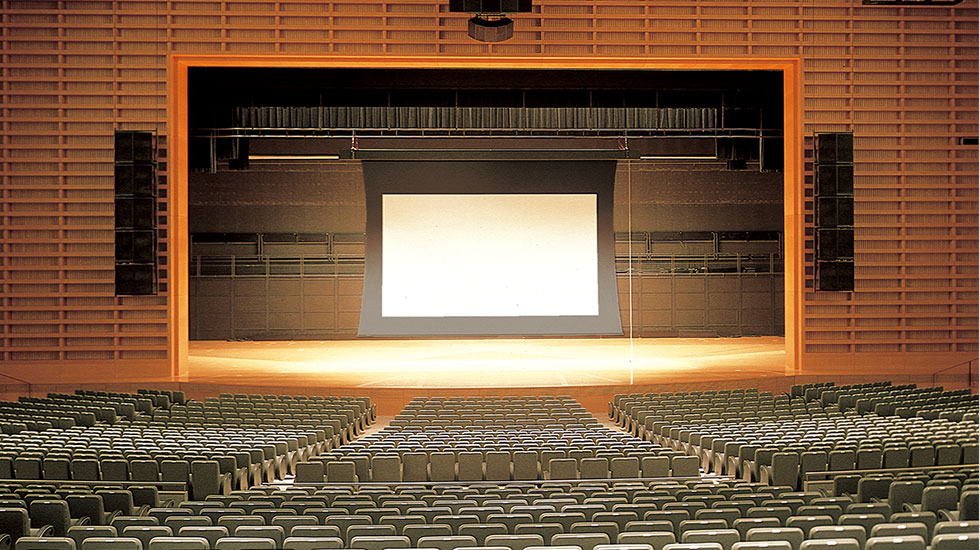 舞台前端部に400HD電動巻き上げリアスクリーンを設置。
